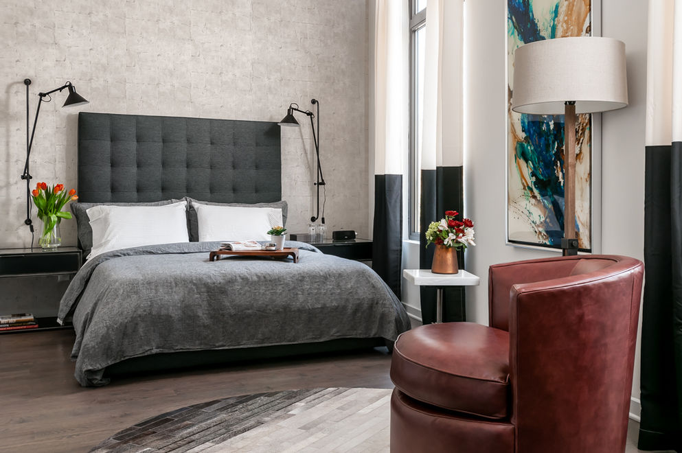 The bedroom provides the ultimate refuge for our client: undeniably masculine and subtly refined. Textured concrete wallpaper, metal bedside tables, and a mix of materials and textures give this room a striking modern industrial vibe. Adjacent to the bedroom, the minimal yet well-appointed home office features a purposeful wood and metal desk and industrial built-in shelving with pops of color, ensuring this space and every other in the home distinctively personal.